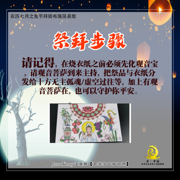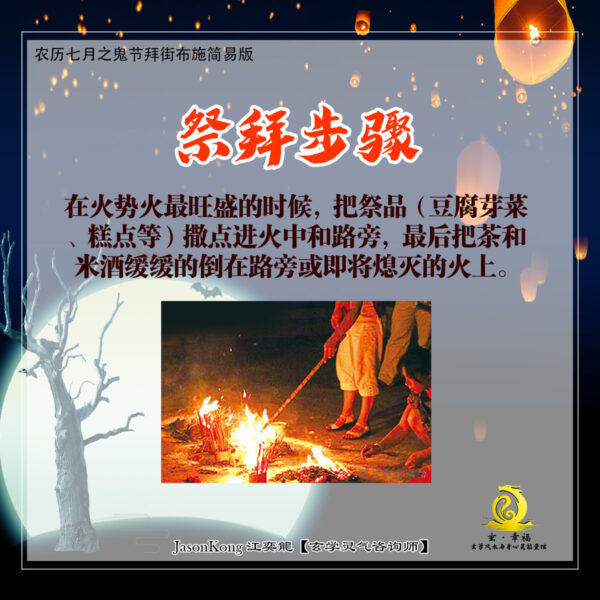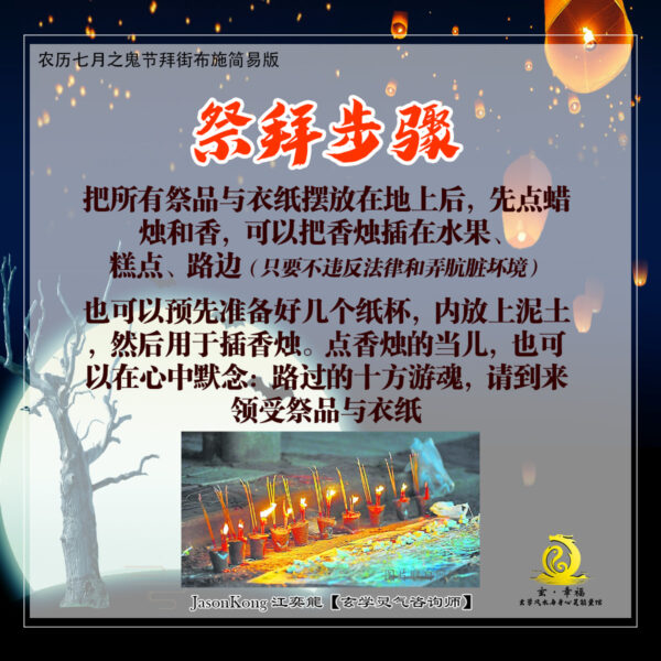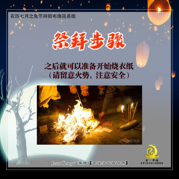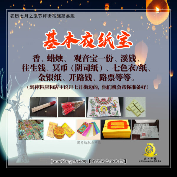 农历七月鬼节拜街布施简易法 Leave a Comment / 玄学风水 / By admin / 16/08/2021 第一次在农历七月拜街边布施十方?想做但完全没经验怕搞错就“弊家伙”咯?不用怕,让我来教你最简单的【农历七月鬼节拜街布施简易法】,跟着做简单又不会出错! 基本衣纸宝: 香、蜡烛、 观音宝一份、溪钱、往生钱、冥币(阴司纸)、七色衣/纸、金银纸、开路钱、路票等等。 (到神料店和店主说拜七月街边的,他们就会帮你准备好) 基本祭品: 豆腐、芽菜、鸡蛋、水饭、苹果、糖果饼干糕点、米酒、茶。 把所有祭品与衣纸摆放在地上后,先点蜡烛和香,可以把香烛插在水果、糕点、路边(只要不违反法律和弄肮脏坏境)也可以预先准备好几个纸杯,内放上泥土,然后用于插香烛。点香烛的当儿,也可以在心中默念:路过的十方游魂,请到来领受祭品与衣纸。 请记得,在烧衣纸之前必须先化观音宝,请观音菩萨到来主持,把祭品与衣纸分发给十方无主孤魂/虚空过往等,加上有观音菩萨在,也可以守护你平安。 之后就可以准备开始烧衣纸(请留意火势,注意安全) 在火势火最旺盛的时候,把祭品(豆腐芽菜、糕点等)撒点进火中和路旁,最后把茶和米酒缓缓的倒在路旁或即将熄灭的火上。 其实在农历七月拜街布施十方是善事的一种,可以累积福德,但切勿用于求财求帮助,只要保持一颗布施的善心,自然会顺顺利利,运势转好!以上的方法是农历七月布施街边的简易法,大家也可以增加更多的衣纸或祭品来祭拜,所谓丰俭由人,多少无拘! 如果你还是觉得害怕,也可以在农历七月间奉请一道结缘驱邪平安符,用于保自身出入平安。也可以使用本人特制的法科化霉开运喷雾防身。 Click here 觉得家里气场不好?老是在家就觉得气场很不顺畅,很想发脾气骂人,坐立不安?可以使用法科特制化煞净化喷雾,把住家、店铺、汽车等气场净化,已达到化煞驱邪的效果。 Click here