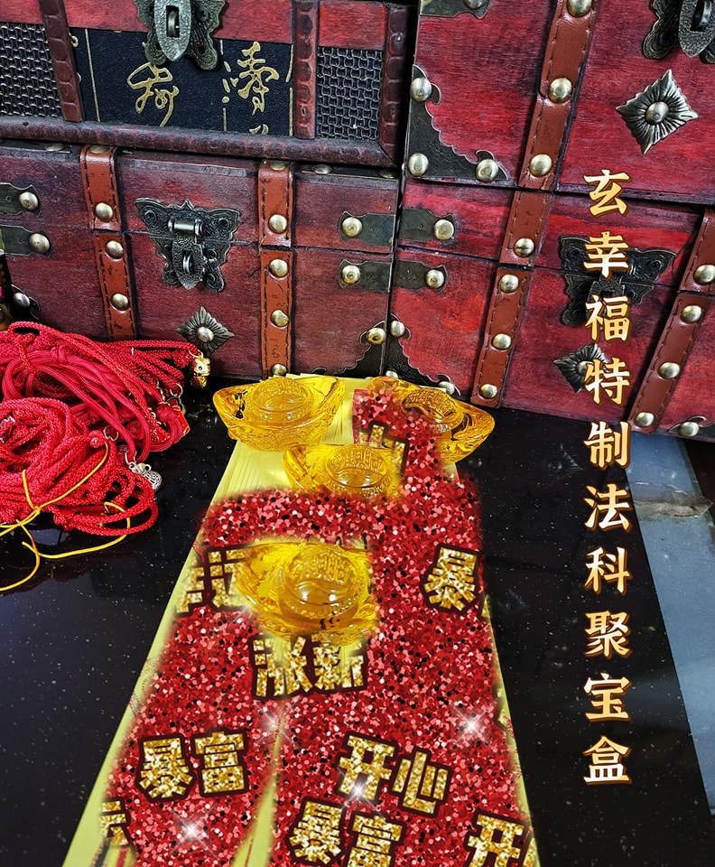 每个人家中都需要一个聚宝盒,摆放在对的位置,经过启动后它会有聚财、招财、纳财等功效。而玄幸福特制法科聚宝盒是运用了法科符咒(五路招财符、聚宝聚财符、贵人招财符、赵公明催财符等等)配合上恭请人(的事业、工作、生意)再加上各类开光五色豆、五色水晶、铜钱与木制宝盒等制作而成。
